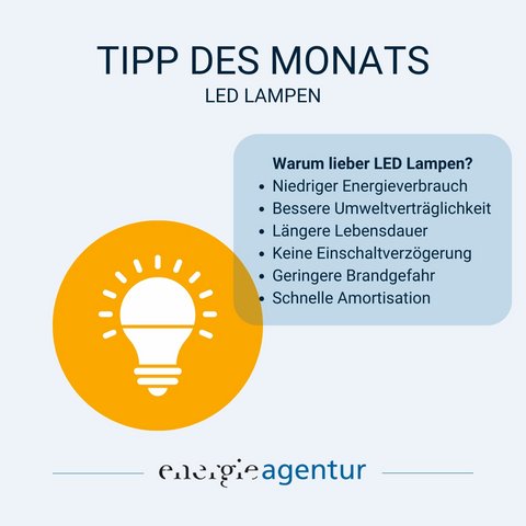 Auch bei der Beleuchtung können Sie viel Energie und Geld sparen. Energiesparlampen und LED können fast überall eingesetzt werden, wo bisher Glühbirnen verwendet wurden. Wegen ihrer extrem hohen Lebensdauer und der sehr großen Energieersparnis rechnen sich die hohen Anschaffungskosten der LED-Lampen zum Teil nach weniger als einem Jahr. Energiesparlampen und LED gibt es in vielen unterschiedlichen Bauformen und mit unterschiedlicher Lichtfarbe. Die Farben „extra warmweiß“ oder „warmweiß“ sind im Wohnbereich eine gute Wahl. Die Farbe „neutralweiß“ oder „tageslichtweiß“ eignet sich eher für Arbeitsbereiche.