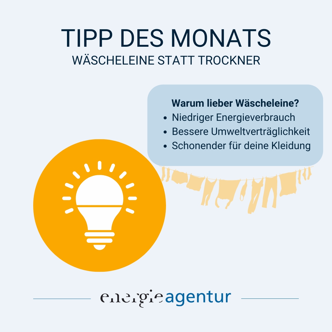 Bei gering verschmutzter Wäsche reichen Waschtemperaturen um 30° C meist vollkommen aus. Kaltaktive Waschmittel reinigen sogar bei noch geringeren Temperaturen. Wenn Sie den Trockner unbedingt benötigen, hilft es, vorher gut zu schleudern. Am effizientesten sind Wärmepumpen-Trockner. Erheblich billiger und ganz klimafreundlich trocknet die Wäsche auf der Leine oder dem Wäscheständer.